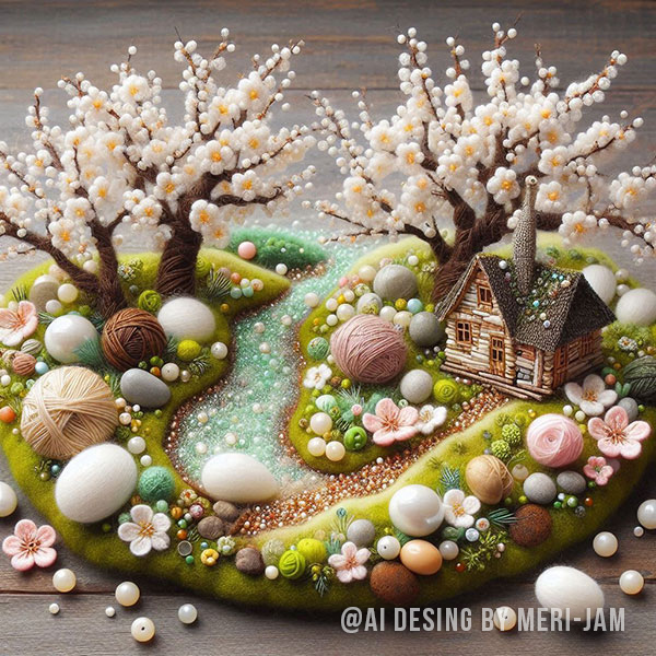 Monit: Wiosenny krajobraz wykonany z koralików, kamieni i wełny